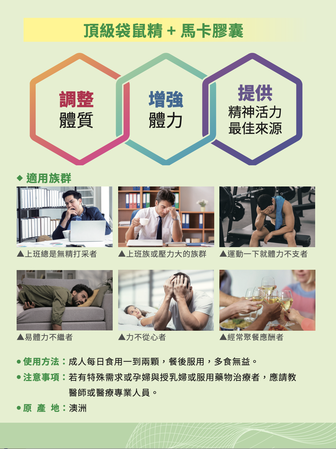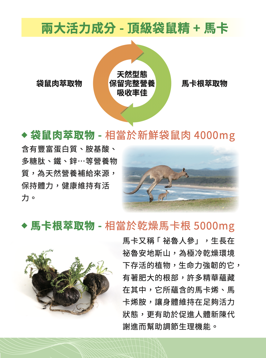 .雙效配方加乘有感:結合袋鼠精與馬卡,提供體力與活力雙重補給,調節身體狀態。